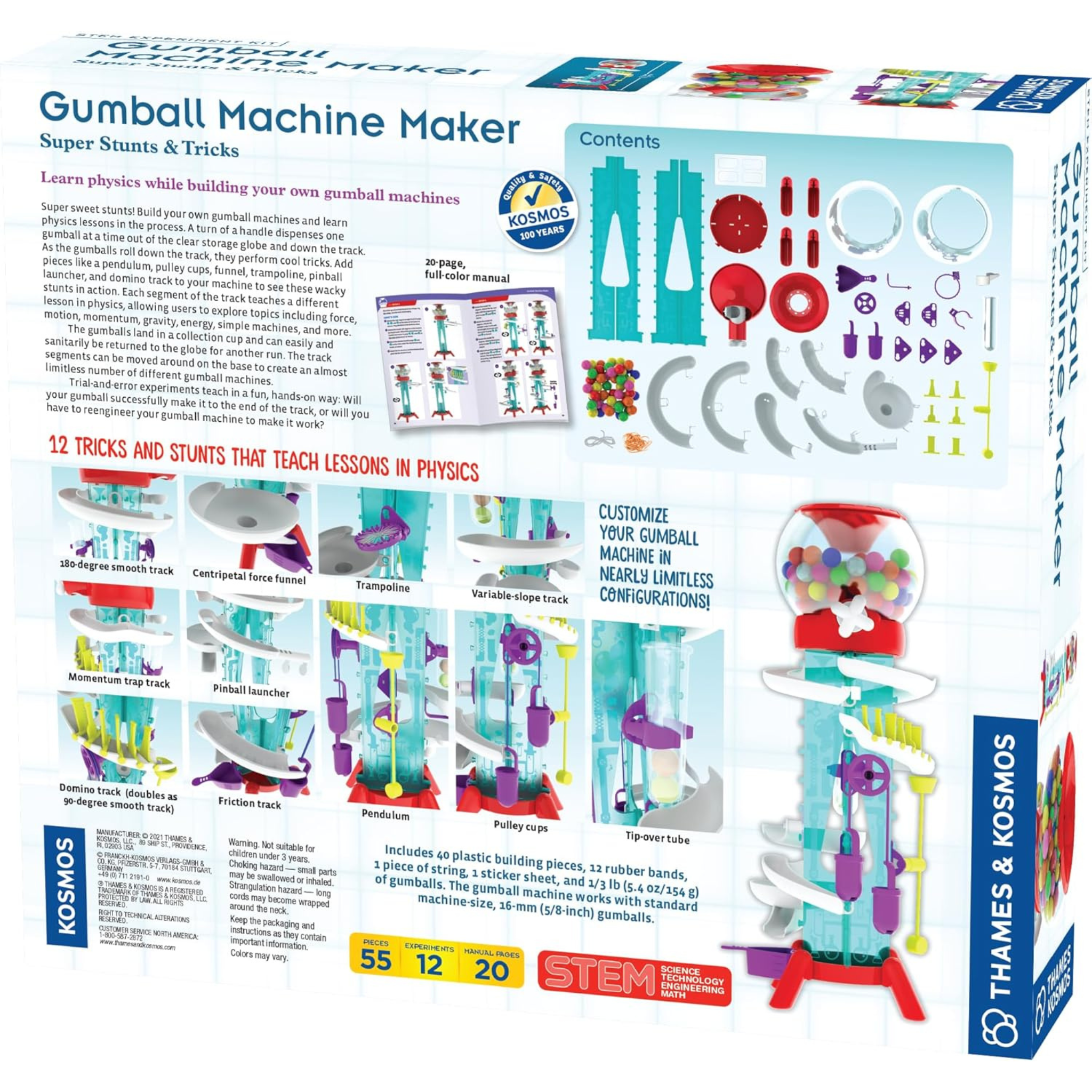 Super sweet stunts! Build your own gumball machines and learn physics lessons in the process. A turn of a handle dispenses one gumball at a time out of the clear storage globe and down the track. The gumballs land in a collection cup and can easily and sanitarily be returned to the globe for another run. The track segments can be moved around on the base to create an almost limitless number of different gumball machines.