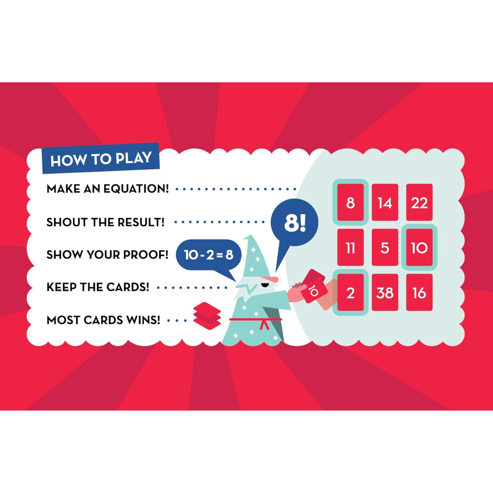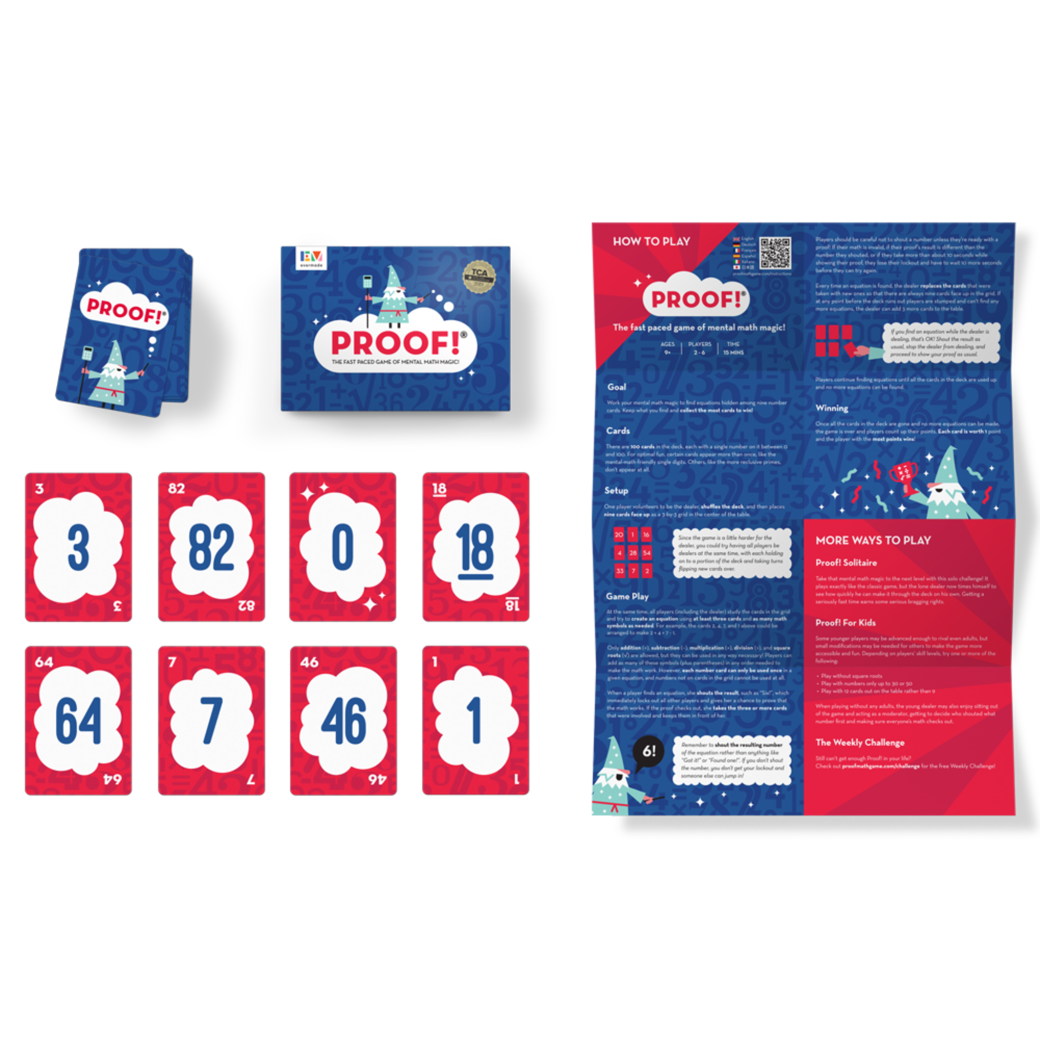 Proof! is an award winning, fast, fun, and addicting math game that the whole family can enjoy! Work that mental math magic as you race to find creative equations hidden among nine number cards. Keep what you find and collect the most cards to win!